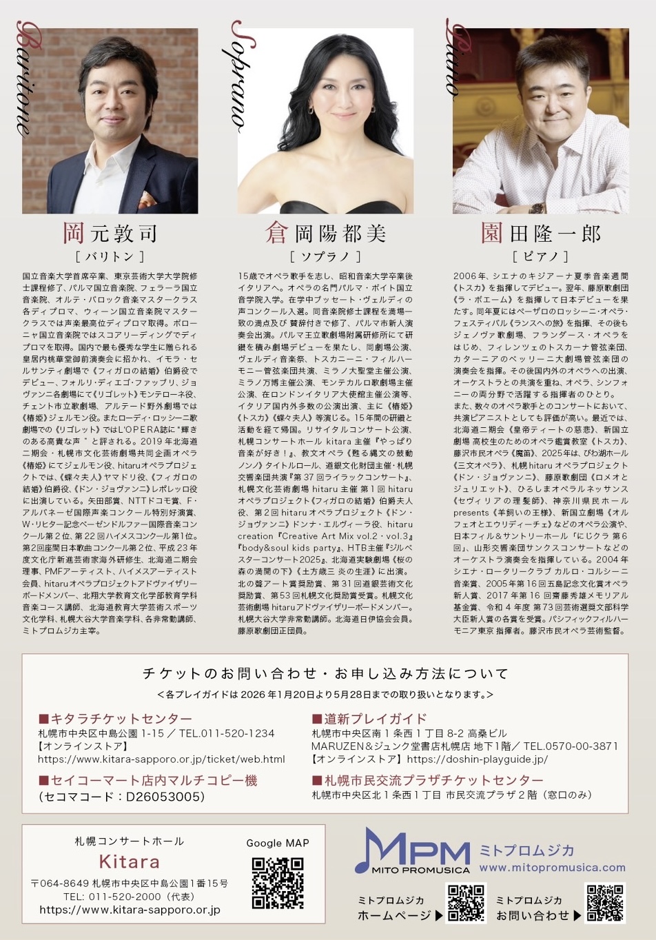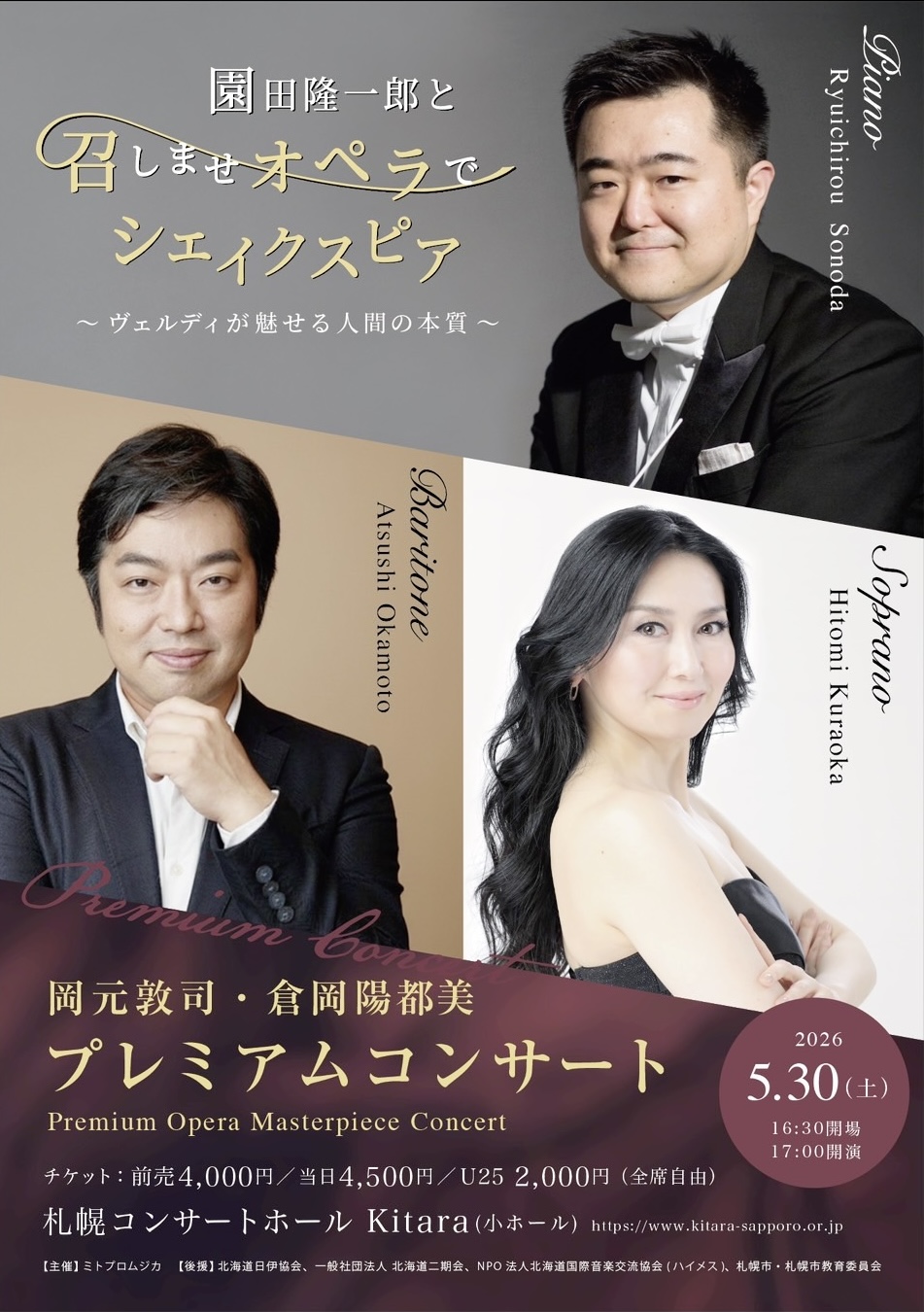 この度 5 月 30 日(土)札幌コンサートホール・キタラ小ホールにて、オペラ指揮者として日本全国で活躍中の園田隆一郎氏と共に、道内のオペラ芸術を微力ながら支えたいと願う私たち、倉岡陽都美、岡元敦司によって『園田隆一郎と召しませオペラでシェイクスピア〜ヴェルディが見せる人間の本質〜岡元敦司・倉岡陽都美プレミアムコンサート』を実施させていただく運びとなりました。